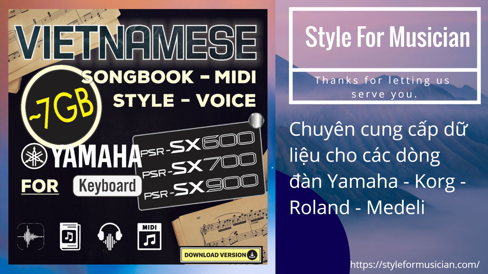 The Vietnamese Songbook, Style, Midi Voice Download is the ultimate music package for Yamaha Keyboard PSR-SX900, SX700, and SX600. With 18,000 intro styles, 4,000 basic styles (including Chacha, Slow, Rumba, Bolero, Twist, Tango, Remix, Disco, and more), 12,000 songbook files (in the range of Am to C), 3,000 midi files categorized by Vần and nhạc chào, multipads, and 8,000 karaoke files, this product offers an incredible collection of Vietnamese music for your keyboard.